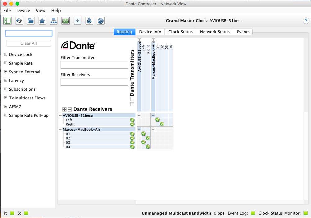 I am using a Dante AVIO as audio interface for Kyma, trying to route my built-in audio on my mac to Dante network.  As you can see the output is running correctly but somehow Dante does not route my built-in microphone.  The error message shows incorrect channel latencies.  Anyone knows how to solve this problem?